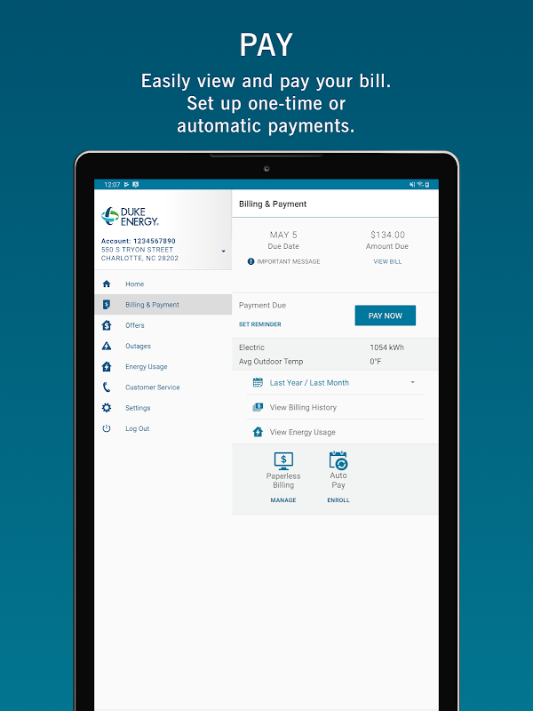 Dengan aplikasi Duke Energy, Anda dapat dengan mudah mengelola dan melihat akun Anda di mana saja, kapan saja. Fitur-fitur terkini aplikasi Duke Energy memungkinkan Anda untuk: