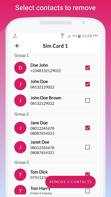 Aplikasi ini memungkinkan Anda untuk memindai duplikat kontak menggunakan nomor ponsel atau nama kontak. Setelah pemindaian kontak, Anda dapat memilih dari daftar akun untuk menghapus duplikat kontak. Kontak yang dihapus akan diekspor ke file .vcf di penyimpanan ponsel Anda, jika Anda perlu mengembalikannya.