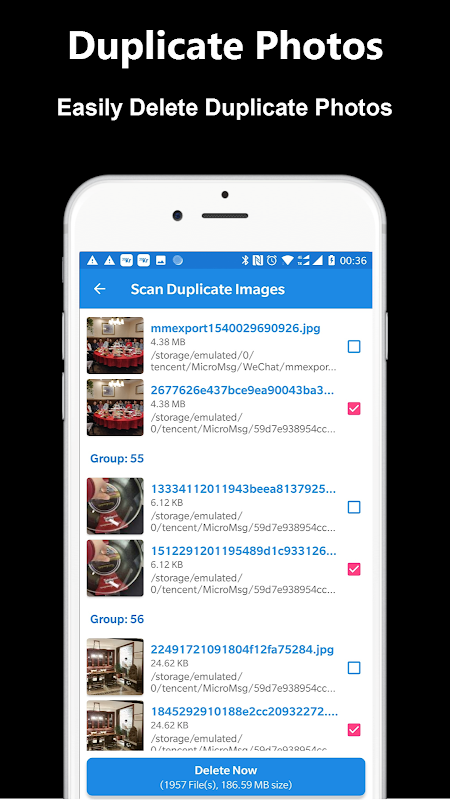 ● Satu Ketuk untuk menghapus File Duplikat: Mudah menemukan dan menghapus File Duplikat.