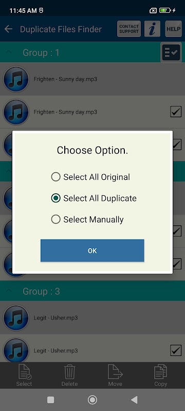 * App menyediakan fasilitas untuk Pilih pilihan untuk dihapus file duplikat dengan: