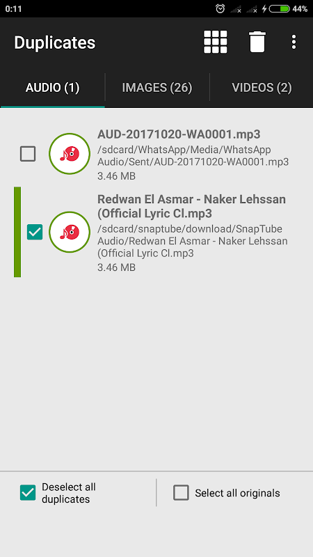 The application removes all duplicate media (audio, images and videos) files present in your internal (phone memory) and external storage (SD card).