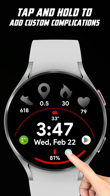 * Ketuk dan tahan untuk menambahkan komplikasi khusus 1 Komplikasi Rentang 1 Teks Pendek dan 2 Pintasan aplikasi dengan Ikon
