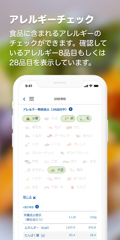 Anda bisa mengecek nutrisi seperti energi, protein, lipid, dan gula yang terkandung dalam makanan. Anda tidak hanya dapat memeriksa nilai yang ditampilkan pada bahan kemasan, tetapi juga nilai gizi per 100g dan per produk.
