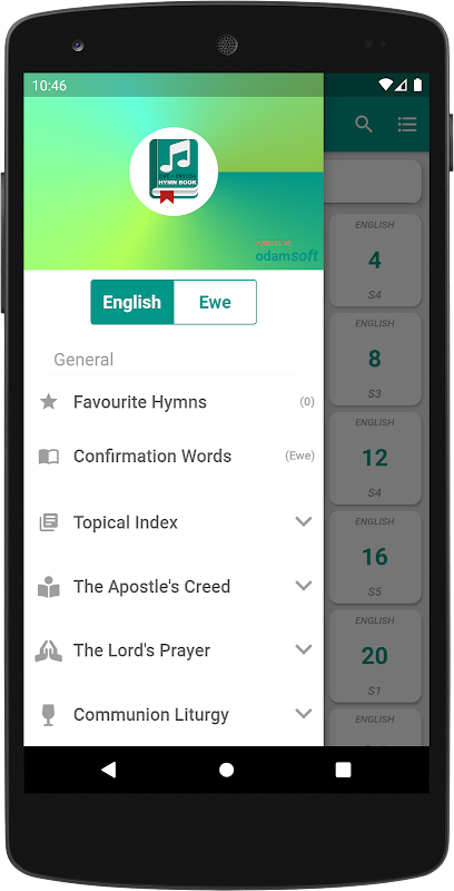 Aplikasi Hymnal E.P.C yang berisi Hymnal Ewe Hadzigbale & Sekolah Mawuli dalam bahasa Inggris