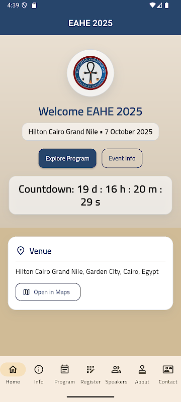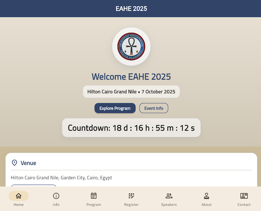 Aplikasi Konferensi EAHE 2025 adalah pendamping digital resmi untuk konferensi tahunan Asosiasi Ekonomi Kesehatan Mesir.