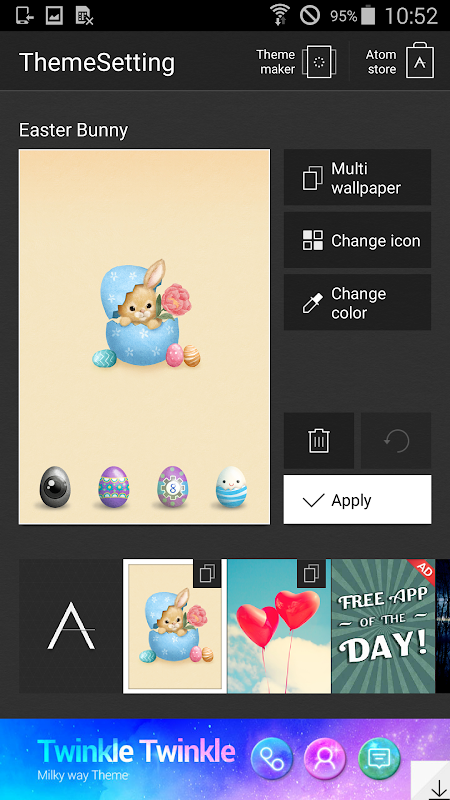 Dengan tema, paket ikon dan widgets yang diperbaharui setiap minggu; bervariasi dari desain yang modern, sederhana sampai ilustrasi seniman yang artistik, Anda dapat menghias layar telepon genggam Anda setiap hari: Cari Atom Store di tab pencarian!!