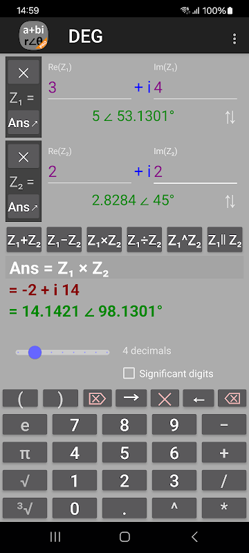 Saat Anda memasukkan bilangan kompleks dalam bentuk kutub, kalkulator bilangan kompleks memungkinkan untuk memasukkan sudut dalam derajat atau radian dan hasilnya juga diberikan dalam derajat atau radian.