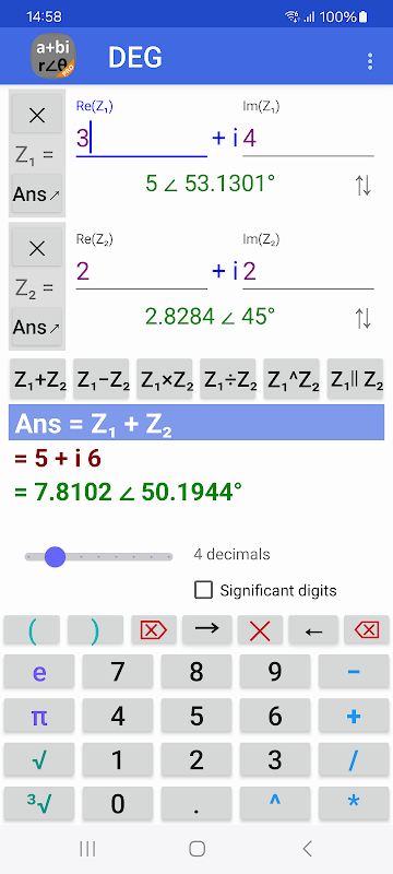 Anda dapat memasukkan bilangan kompleks dalam bentuk persegi panjang, a + ib, atau bentuk polar, r∠θ. Kalkulator kompleks mengkonversi dari bentuk persegi panjang ke bentuk kutub secara otomatis dan sebaliknya.