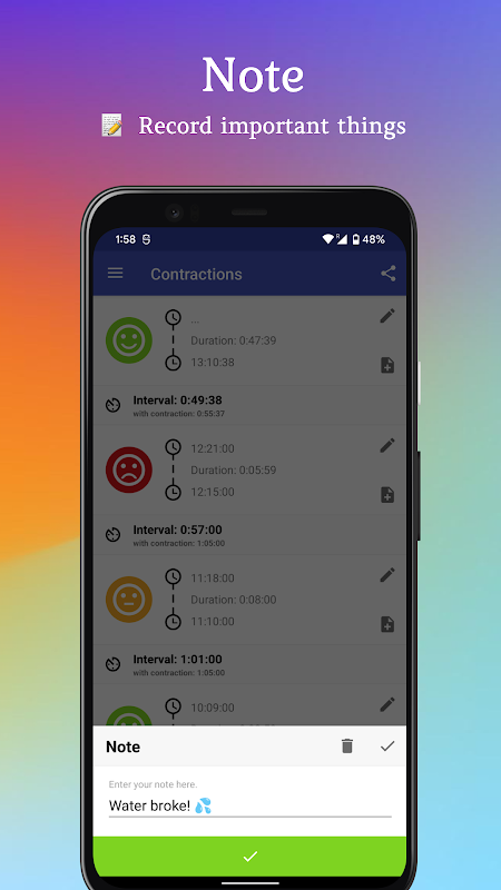 Dengan versi terbaru dari waktu kontraksi sekarang juga memungkinkan untuk memantau intensitas kontraksi Anda dan mendapatkan grafik informatif berdasarkan informasi ini. Hal ini juga memungkinkan untuk mengedit atau melanjutkan kontraksi dengan mengklik ikon pensil jika anda tidak sengaja berhenti itu. Selain itu menghapus kontraksi semudah menggesekkan itu dari layar.