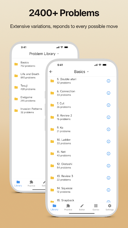Asah keterampilan Anda dengan 2.400 soal bawaan yang mencakup dasar-dasar, hidup dan mati (tsumego), tesuji, dan teknik akhir permainan.