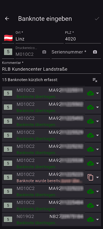 Untuk uang kertas bernomor urut, Anda memindai kode cetak sekali dan kemudian beberapa nomor seri. Untuk uang kertas bekas, Anda harus memindai secara bergantian antara kode cetak dan nomor seri.