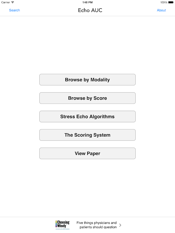 The ASE Echo AUC App provides a simple, practical approach for physicians to pursue additional professionalism in their daily practice in a more accessible and attainable way. The physician will be motivated to use this app because he/she will be able to have an immediately accessible source to make a quick decision for patient care that is backed up by expert opinion. The physicians will find it easy to use the free AUC App to stratify the patient, by disease and condition, into different treatment scenarios and determine quickly whether an echo should be ordered. They will also be prompted with information on how to best describe these testing limitations to the patient. They will then have more time to focus on the care of the patient and be able to eliminate extra, unneeded or overused testing. This App includes the 98 AUC indications for transthoracic echocardiogram (TTE).