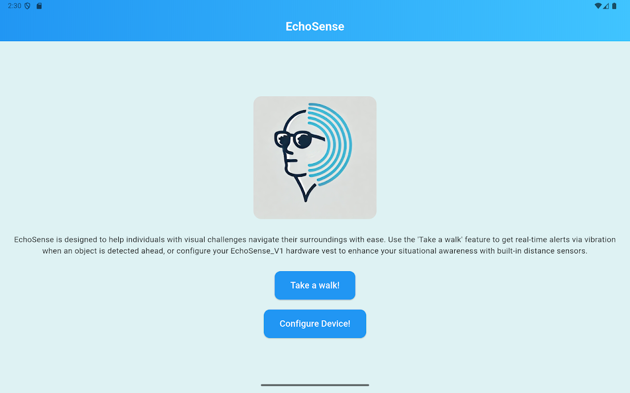Menggunakan AI canggih dan umpan balik haptik, EchoSense mengubah lingkungan Anda menjadi getaran intuitif. Cukup sambungkan perangkat echosense_v1 melalui Bluetooth, luncurkan aplikasi, dan mulai bergerak — EchoSense akan memperingatkan Anda ketika objek di sekitar terdeteksi, membantu Anda bernavigasi dengan aman dan percaya diri.