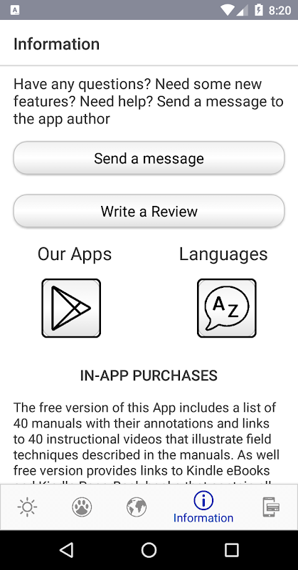 Versi gratis Aplikasi ini mencakup daftar 40 manual dengan anotasinya dan tautan ke 40 video instruksional yang menggambarkan teknik lapangan yang dijelaskan dalam manual. Anda dapat membeli manual langsung di aplikasi dalam berbagai pilihan: semua 40 manual ($8,99), serta manual dibagi dengan 6 topik ($3,99) atau dengan 4 musim dalam setahun ($6,99).