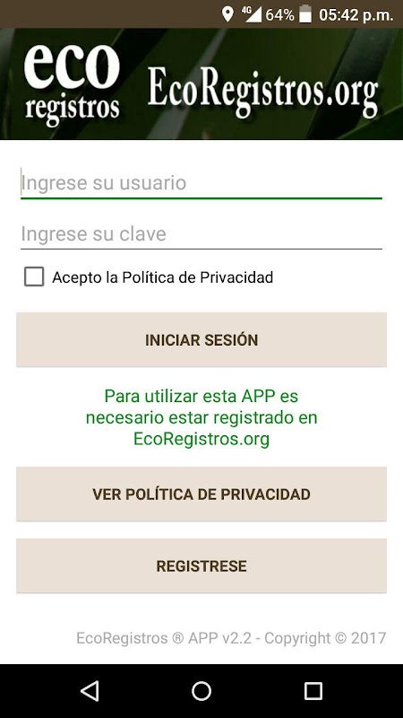 APP menggunakan LOCATION OF THE DEVICE dan INTERNET (berfungsi dengan 3G, 4G atau WI-FI), dan perlu terdaftar di EcoRegistros.org agar dapat menggunakannya. Ini adalah aplikasi yang bekerja dengan cara yang terhubung dengan situs web EcoRegistros, yang memungkinkan APP menjadi sangat ringan untuk pengunduhan, hanya beratnya 2 MG !, dan ketika menambahkan spesies, negara, provinsi, lokasi atau tempat yang terperinci Dalam database situs, ini dimasukkan ke dalam APP secara instan untuk menerbitkan rekaman, tanpa perlu memperbarui APP. Berorientasi pada publikasi catatan dan hiburan, memiliki: