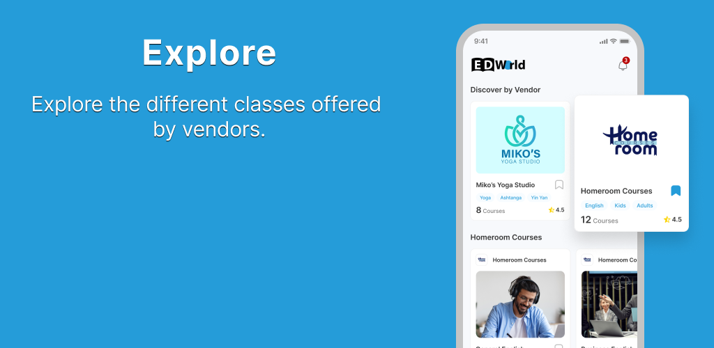 Aplikasi ED World memungkinkan Anda memesan kelas langsung dan langsung yang ditawarkan oleh vendor berbeda. Baik itu Bahasa Inggris atau Yoga, Matematika atau Cross Fit, jelajahi berbagai kelas yang ditawarkan oleh vendor berbeda, beserta jadwalnya. Pesan kelas favorit Anda secara online, dan dapatkan pemberitahuan saat kelas dimulai.