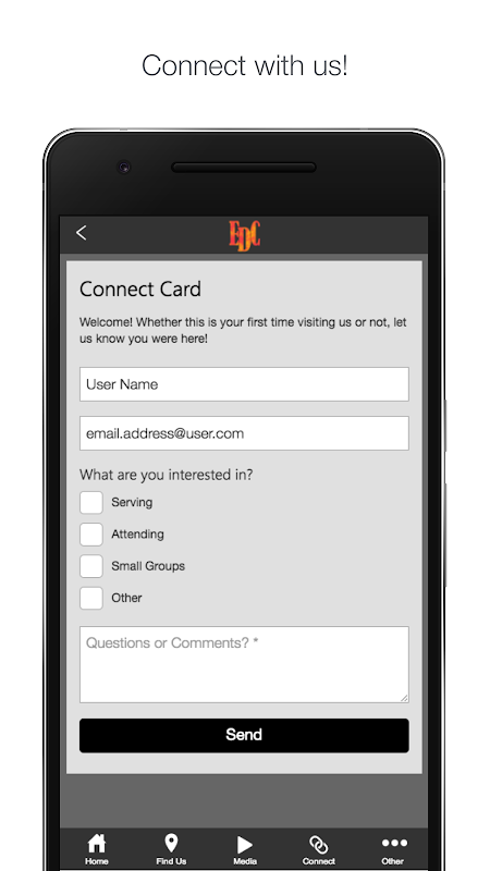 Connect and engage with the EDC app! You will be able to fill out prayer request cards, give, get a map to the church, and more!