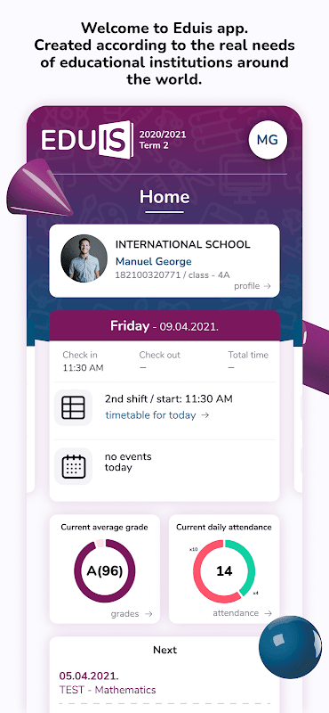 Aplikasi Eduis untuk siswa dan orang tua memberikan gambaran yang jelas tentang mata pelajaran sekolah, jadwal kelas, nilai, kehadiran dan kalender aktivitas untuk organisasi dan keterlibatan yang lebih baik.