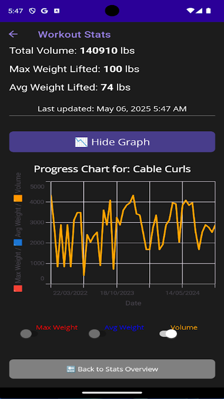 Lihat tren volume, maksimal satu repetisi, peringatan pencapaian, dan grafik historis.