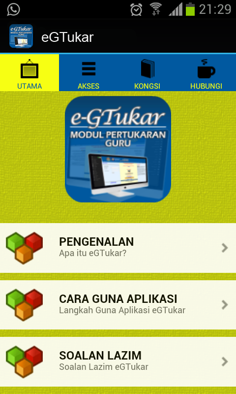 Sebagai pengguna aplikasi android yang mementingkan keselamatan data peribadi, anda mempunyai pilihan samada untuk akses laman modul eGTukar secara terus melalui aplikasi ini atau menerusi pelayar web (browser) pilihan anda.