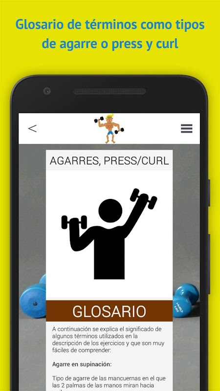 Por último se incluye un glosario de términos para poder entender mejor las descripción de los ejercicios y las rutinas de entrenamiento tales como curl, press y tipos de agarre (pronación, supinación, neutro y mixto).
