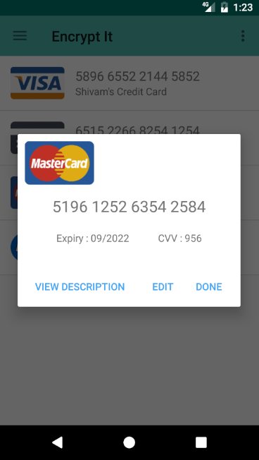 Here is the solution 'Encrypt It'. This app will save your data safely and you will never have to remember passwords or card details anymore. We converts your passwords, files and card details into encrypted files, so that intruder does not have any access to this. We use "SHA-512" algorithm in our app which is unbreakable, unhackable. So your data is safe.