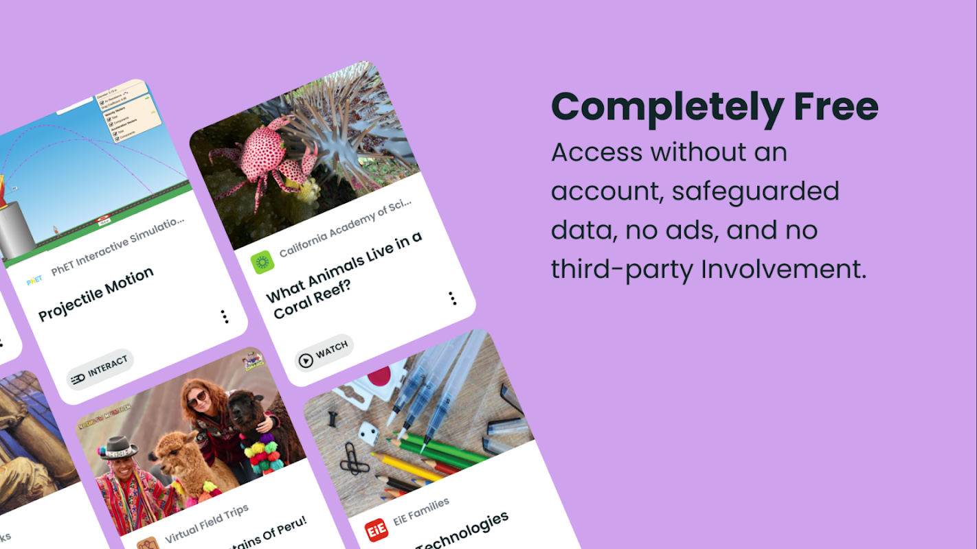 Aplikasi pribadi dan aman untuk Chromebook dan perangkat Windows, tempat siswa dapat menjelajahi lusinan sumber daya pendidikan yang dipilih dengan cermat untuk memberikan pembelajaran yang lebih luas. Jelajahi opsi berbasis minat seperti coding, seni & kerajinan, memasak, dan STEM, baik online maupun offline. Sebagian besar sumber daya dalam bahasa Inggris, dengan sejumlah kecil dalam bahasa Spanyol.