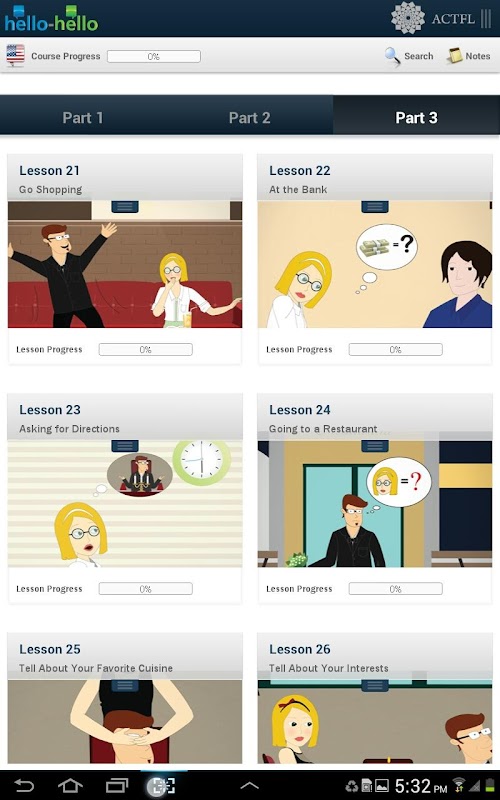 Hello Hello-English adalah kursus bahasa penuh dengan 30 PELAJARAN dikembangkan dalam kerjasama dengan American Council pada Pengajaran Bahasa Asing (ACTFL), sehingga Anda dapat yakin bahwa pelajaran ini mengikuti metodologi berbasis penelitian yang efektif. Semua pelajaran percakapan berdasarkan dialog yang realistis dan situasi, daripada koleksi out-of-konteks kata-kata dan frase.