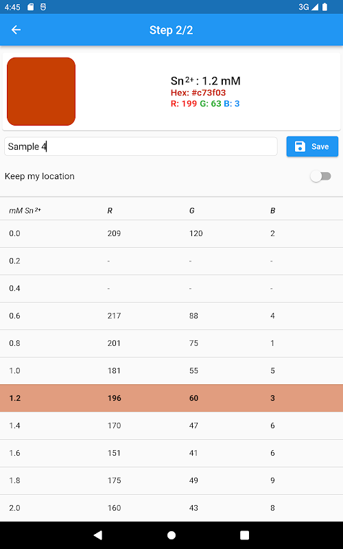 Setelah itu, aplikasi menyimpan riwayat warna yang disimpan. Data dapat dibagikan atau diimpor / diekspor ke file csv untuk analisis lebih lanjut.