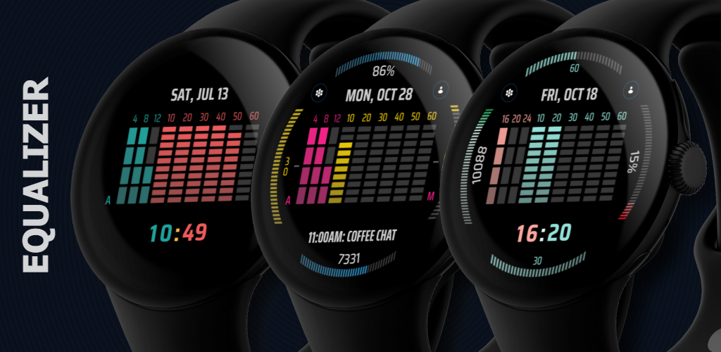 Equalizer - Terinspirasi oleh estetika visual equalizer audio, tampilan jam Wear OS ini tidak hanya menunjukkan waktu tetapi juga melakukannya dengan gaya dan presisi.