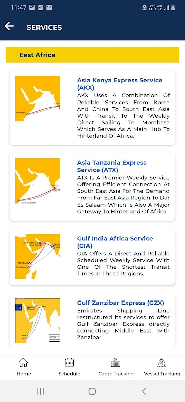 - Layanan termasuk rotasi, waktu transit, terminal, pelabuhan keluar dan tabel pedalaman