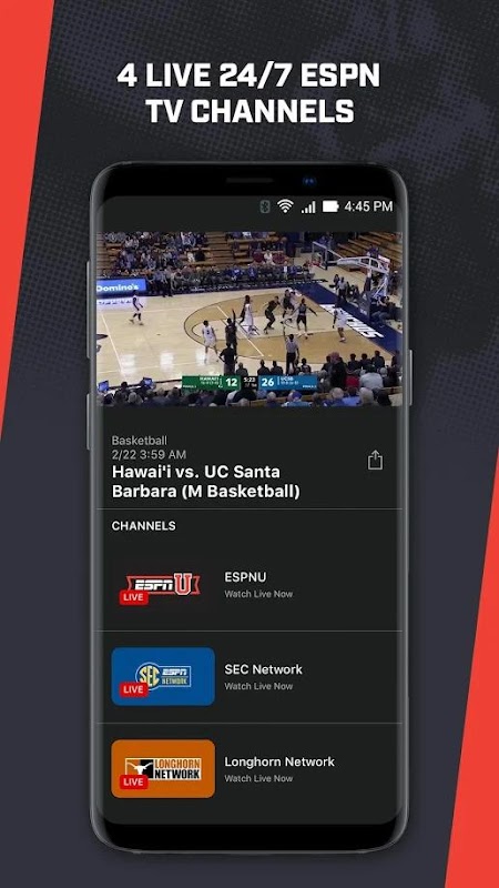 • Empat Saluran TV ESPN tersedia 24/7 (Jaringan SEC, Jaringan ACC, ESPNU & Jaringan Longhorn)
