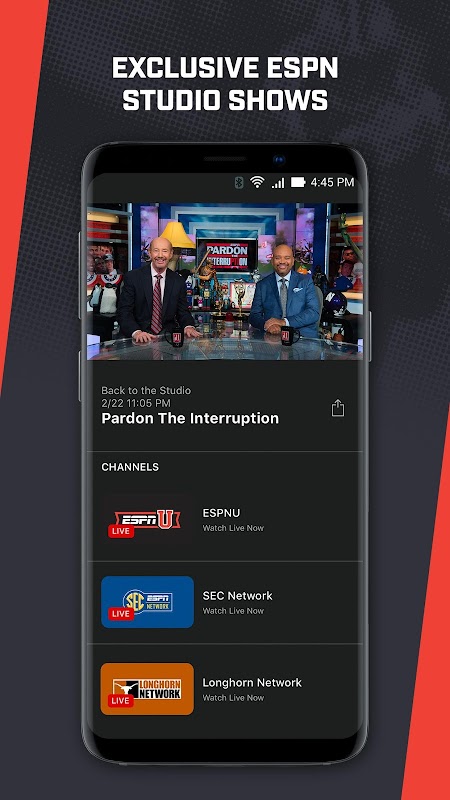 • Pertunjukan ESPN Studio termasuk College GameDay, & Maafkan Interupsi.