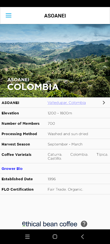 Sebuah aplikasi gratis untuk peminum Ethical Bean Coffee yang memungkinkan Anda melacak setiap kantong kopi dari tanaman hingga cangkir. Kami memberi Anda akses ujung jari ke informasi petani, panen, dan negara asal. Detail pemanggangan, catatan cupping, video dan foto tersedia untuk rangkaian lengkap Ethical Bean Coffee. Tidak dapat menemukan kopi Ethical Bean di toko kelontong Anda? Periksa situs webnya di www.ethicalbean.com, atau beli secara online.