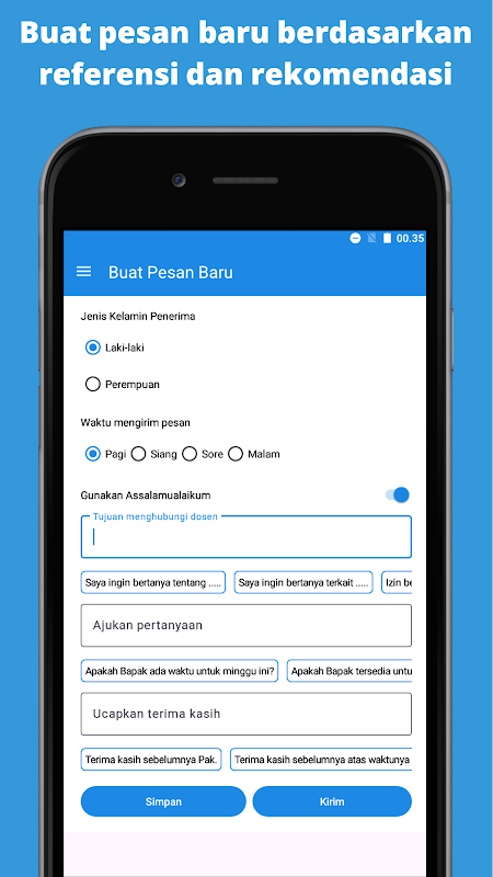 Referensi Pesan : Aplikasi ini menyediakan berbagai referensi pesan yang bisa disesuaikan dengan kebutuhan mahasiswa. Referensi ini mencakup berbagai situasi umum, seperti permohonan izin dan pengajuan bimbingan.