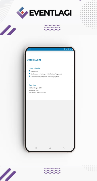 Eventlagi adalah aplikasi untuk memindai kode QR untuk berbagai acara seperti pesta, seminar, pernikahan, dll. Fungsinya untuk memastikan undangan valid dengan memindai Kode QR. Kami tahu bahwa mengadakan acara bisa sangat menegangkan, oleh karena itu kami berusaha sebaik mungkin untuk membantu Anda mengelola daftar tamu Anda. Hanya dengan langkah sederhana untuk mengatur tamu Anda, kirimkan pengingat untuk acara yang akan datang, dan kendalikan kehadiran tamu dengan kode QR atau nama tamu.