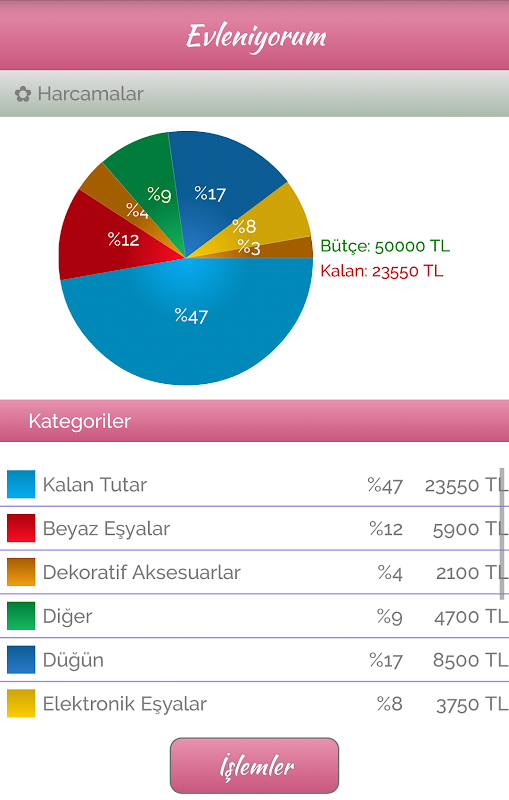 ✿ Harcamalar modülü: Evlilik sürecinde yaptığınız harcamaları, kategorilere ayırarak burada listeleyebilirsiniz.