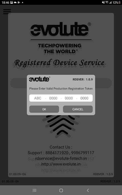 Ini adalah Terdaftar Perangkat Service (L0) untuk evolute Devices dengan Fingerprint Scanner untuk perangkat LEOPARD, FALCON, Impress, LILY dan IDENTI5 disediakan oleh Sistem evolute Pvt Ltd Aplikasi ini diperlukan untuk menggunakan perangkat dengan otentikasi Aadhaar. Aplikasi ini menangkap sidik jari sesuai pedoman UIDAI untuk Aadhar Otentikasi dan eKYC. RD Layanan untuk perangkat kami memungkinkan solusi Anda dan pengguna akhir untuk memvalidasi perangkat Fingerprint mereka dengan UIDAI dengan bantuan Server Management kami. Untuk mendaftarkan perangkat Finger print dengan UIDAI, Anda akan perlu berada dalam kepemilikan minimal satu unit perangkat evolute. Dengan meluncurkan aplikasi dan menghubungkan perangkat, layanan RD harus menyelesaikan proses yang diperlukan untuk mendaftarkan perangkat Anda dengan UIDAI. RD Layanan STQC bersertifikat sesuai UIDAI Terdaftar Perangkat Keterangan-v2.0.1. Perangkat dirancang untuk penggunaan sebagian santai sambil penempatan jari. Perangkat yang dibuat untuk menahan jumlah besar shock bahkan jatuh bebas dari per tes musim gugur. Dalam kasus kesalahan, Anda akan diberikan pesan kesalahan yang sesuai dengan yang Anda dapat mendekati meja bantuan kami seperti yang diberikan di bawah ini pada setiap hari kerja selama jam kantor.