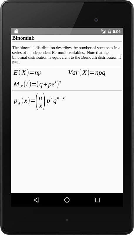 Compiled here is the most vital information on each of those distributions, Keep this app on your telephone screen while working practice problems to simplify the process of finding the formulas for the expected value, variance, and where applicable pdf, pmf, cdf and moment generating function. Each distribution has a short description of it's use.