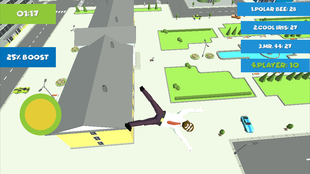 In this game, you will control a ragdoll man who can explode all the cars by jumping on top of them! Then he flies away with a ragdoll controls. You will play against three other car exploders, make sure you have some cars to explode! Score is earned by exploding as much city cars as you can. More combo you make, moke score you get for 1 car!