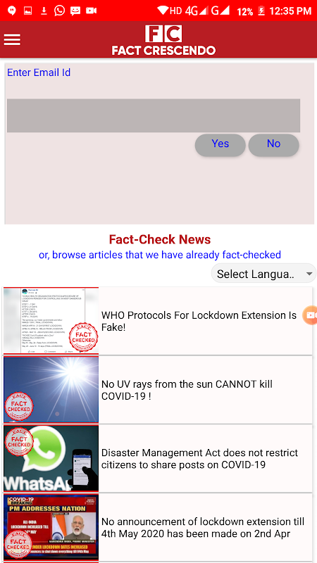 The app name is Fact Check which is using to display all the verified Fact news to users with different languages and also user can check whether the new is fake or not with the help of text, visual and video search, user just need to enter and upload a image/ video to know the news in fake or not. which include ML gives the replay with the help of google AI api's whether the news is fake or not , if news didn't exist in google data base human interaction will be there to do do fact check/research on the particular request and send response to them, App contains strong server and data base which can give response soon and store n number of news getting from clients, Here we are providing 10 different language which user can select any particular language to know the information about the already verified news or user can select the language when user is submitting the request, So user will get the response in the same language. request and response which was happening by the email id when ever the user want a particular news to be fact check, user can send the request by submit button the application will pop to enter mail id and asking for desired language , so while getting the response based on this steps user will get the response in particular language whether news is fact check or not .