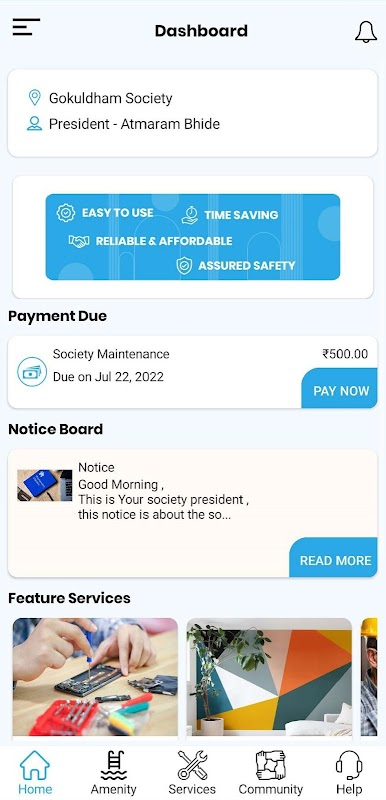 The society management app has introduced various features to serve members for their service needs.