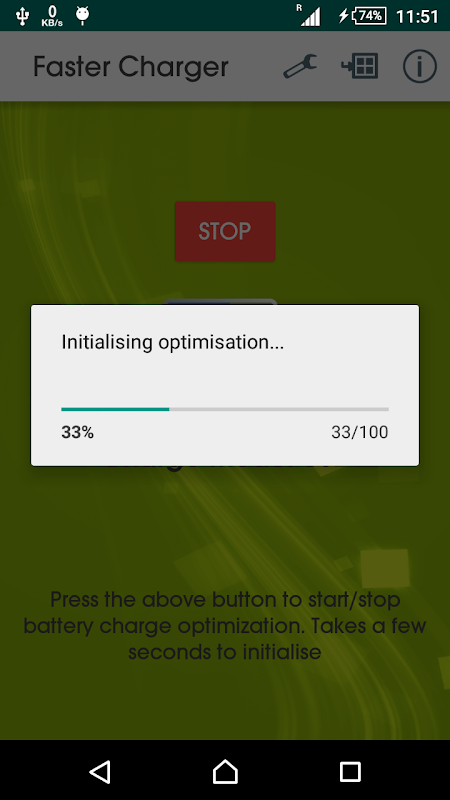 This app is automatic awaken when you plug in your charger , click start to speed up the charging process and at any level you can click exit to resume all the signals.