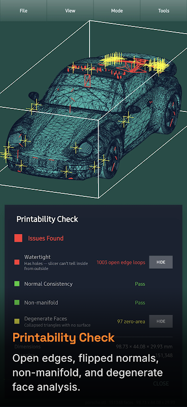 Empat pemeriksaan mesh otomatis: tepi terbuka, normal terbalik, geometri non-manifold, segitiga degeneratif. Overlay 3D interaktif menyoroti setiap masalah langsung pada model Anda. Tangkap cacat sebelum membuang material dan waktu mesin.