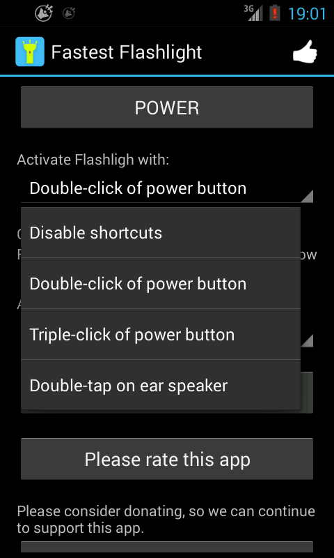 - If you read something on the phone, and the screen goes off, and you press the power button to wake it up again, the flashlight will turn on. You can either change the app's settings to triple-click, or set the click speed to some faster value.