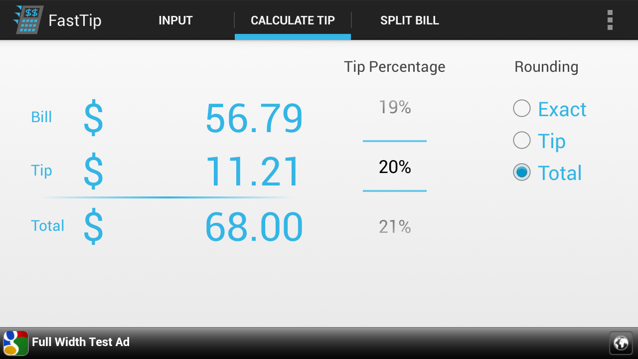 FastTip is a tip calculator. You may be asking, "Why should I download it? What makes FastTip different from all the other tip calculators out there?" FastTip was specifically designed to be the easiest to use tip calculator app on the Play Store. Here's the best part - IT'S FREE!