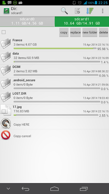 - Shows SD card, internal storage, USB devices in separate tabs