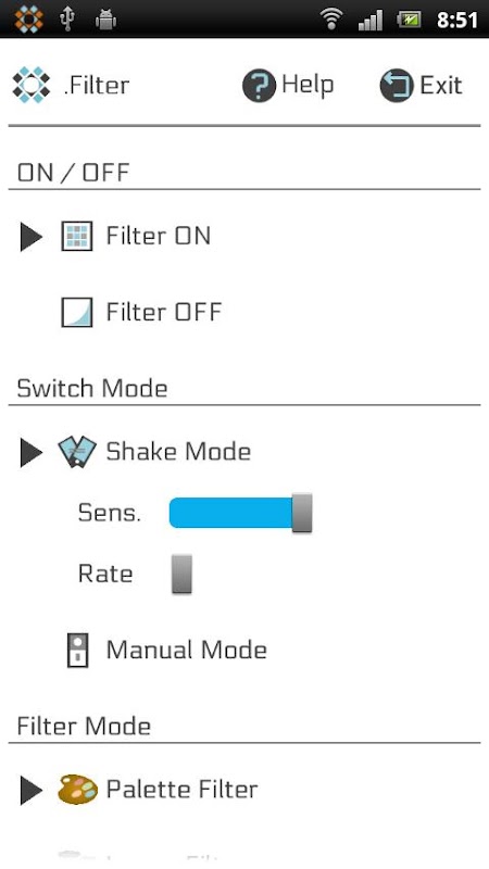 [4]When the Shake Mode, the filter is turned on / off by shake the smartphone. When the Manual Mode, on / off switches by clicking on the message of the notification bar.