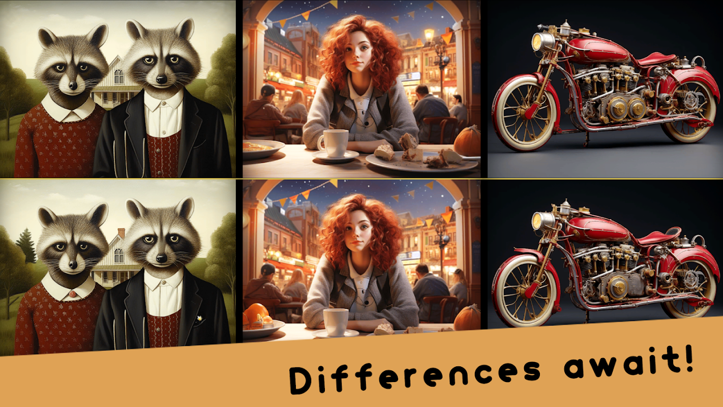 Dalam game ini, ketelitianmu terhadap detail akan diuji saat kamu menjelajahi setiap gambar yang didesain rumit untuk menemukan perbedaan halus. Mulai dari potret wanita dan pria muda yang cantik, hewan, monster fantastis hingga pemandangan menakjubkan, teknologi dan perangkat fantastis yang tidak ada dalam kenyataan, setiap gambar adalah mahakarya yang menunggu untuk dijelajahi.