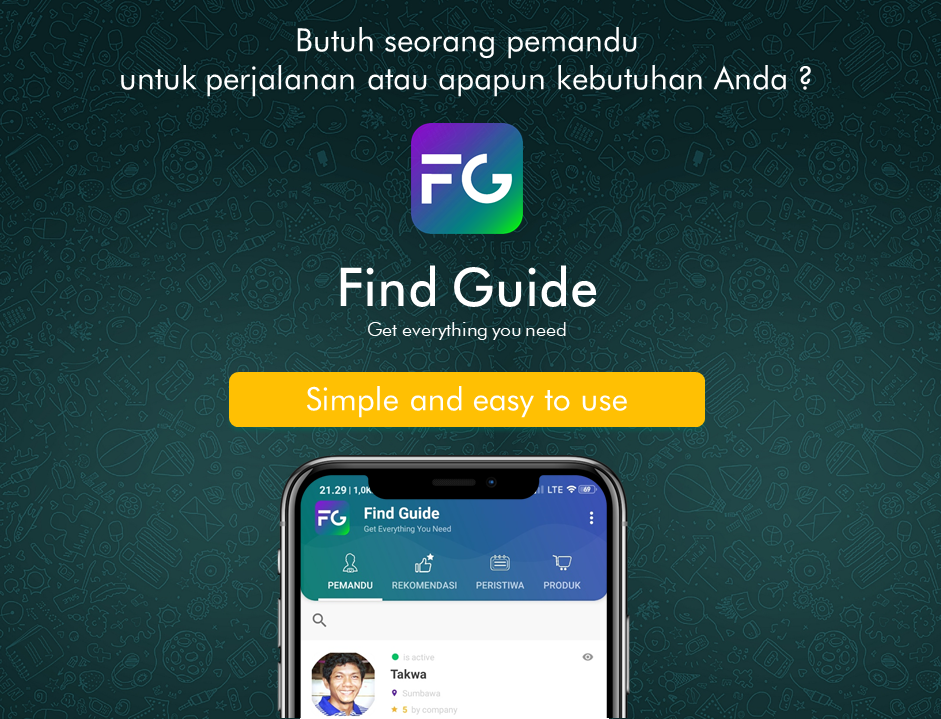 Find Guide merupakan platform yang dikhususkan untuk Anda yang suka jalan-jalan atau berwisata. Dengan hadirnya platform ini akan sangat membantu Anda dalam menemukan wisata daerah dengan cepat dan mudah untuk kebutuhan jalan-jalan wisata, liburan atau kebutuhan lainnya. Platform ini menyediakan berbagai informasi yang sangat membantu seperti informasi tempat wisata, restoran, hotel, toko, resort, rumah sakit, co-working space, dan masih banyak lagi.